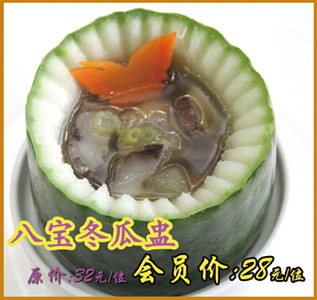 八宝冬瓜盅此菜汽清色白,冬瓜肉鲜嫩柔软,味清香,是夏季时令汤菜。具有润肺生津、化痰止渴、利尿消肿、清热祛暑的功效;