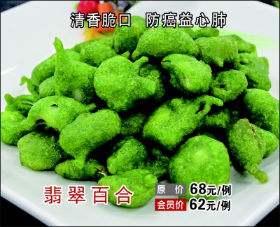 百合具有防癌抗癌、补益心肺的功效,将新鲜蔬菜汁起脆浆鲜炸百合,使得此菜更加清香脆口,是非常适合初冬的一款菜品。