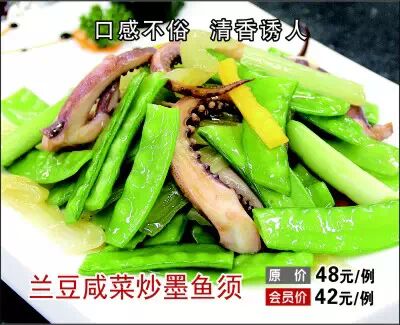 兰豆和咸菜富含食用纤维和矿物质元素,与墨鱼须配搭炒制,口感不俗,清香诱人。