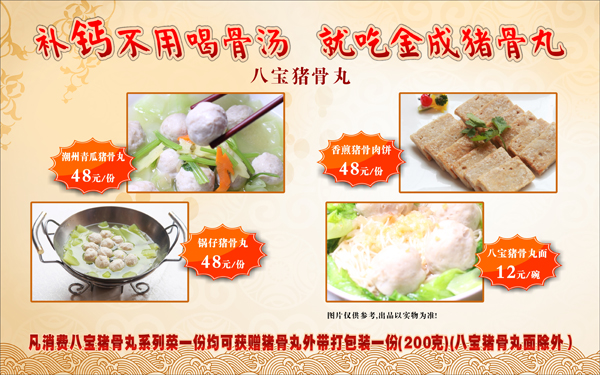 适逢金成潮州酒楼推出与北京御秀营养研究院的联手研制,专为国人饮食文化和营养结构量身打造的八宝猪骨丸。正是一种营养价值极高的新型功能食品,是人体补充蛋白质很好的途径。