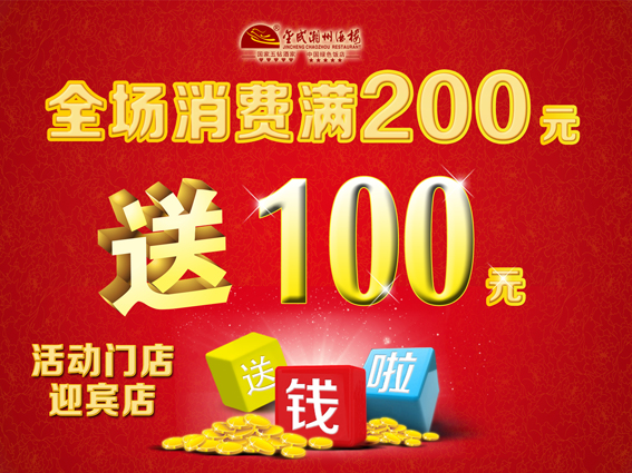 从即日起到2013年11月30日,凡到迎宾店消费满200元即送100元!恭候您的光临!