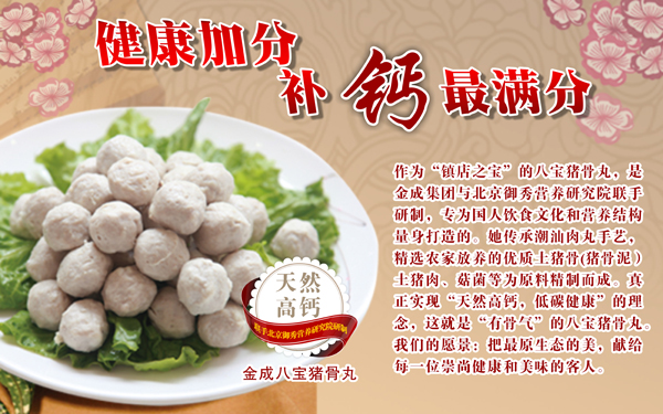 适逢金成潮州酒楼推出与北京御秀营养研究院的联手研制,专为国人饮食文化和营养结构量身打造的八宝猪骨丸。正是一种营养价值极高的新型功能食品,是人体补充蛋白质很好的途径。
