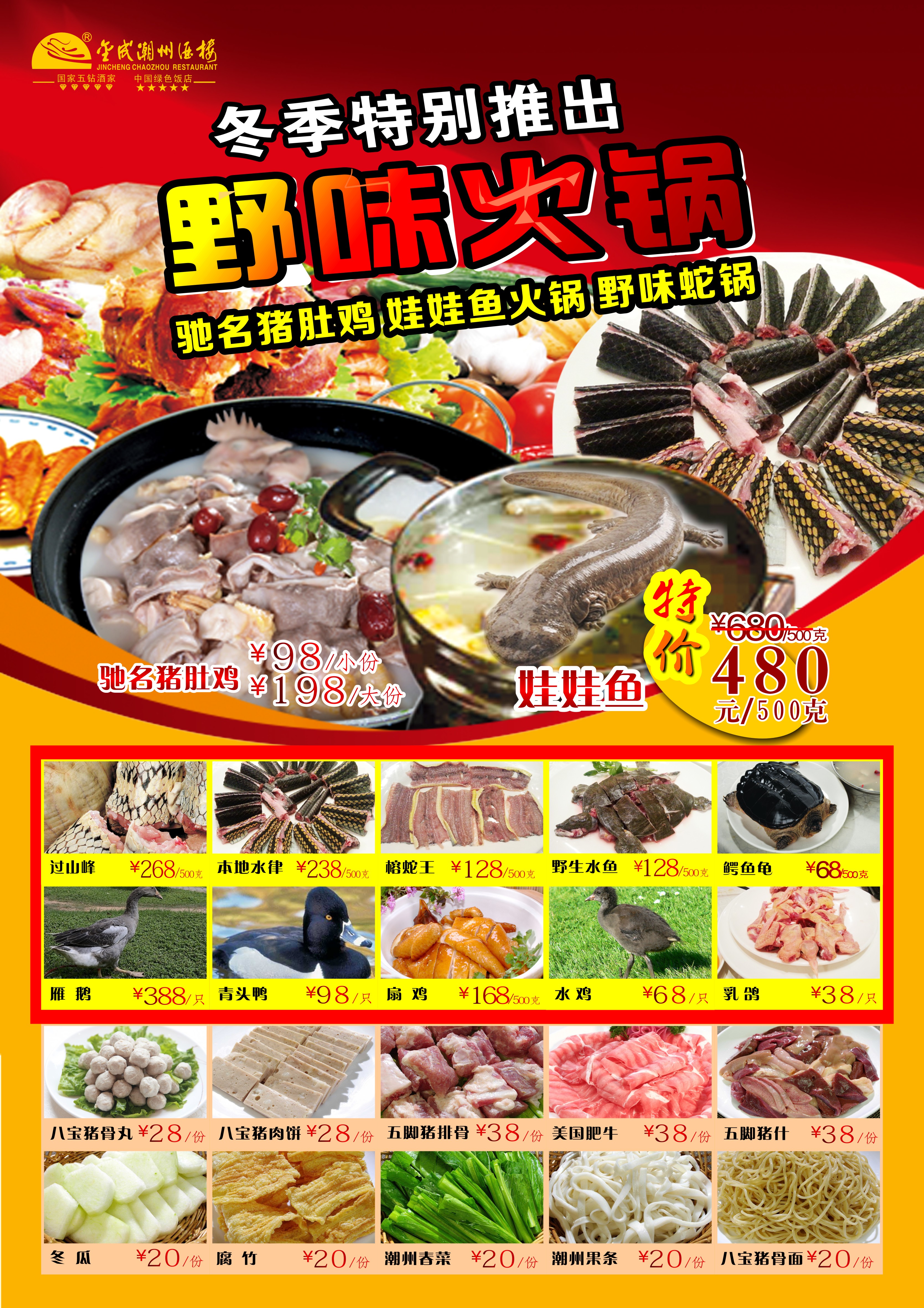 产品名称:冬季特别推出:野味火锅(驰名猪肚鸡、娃娃鱼火锅、野味蛇锅)